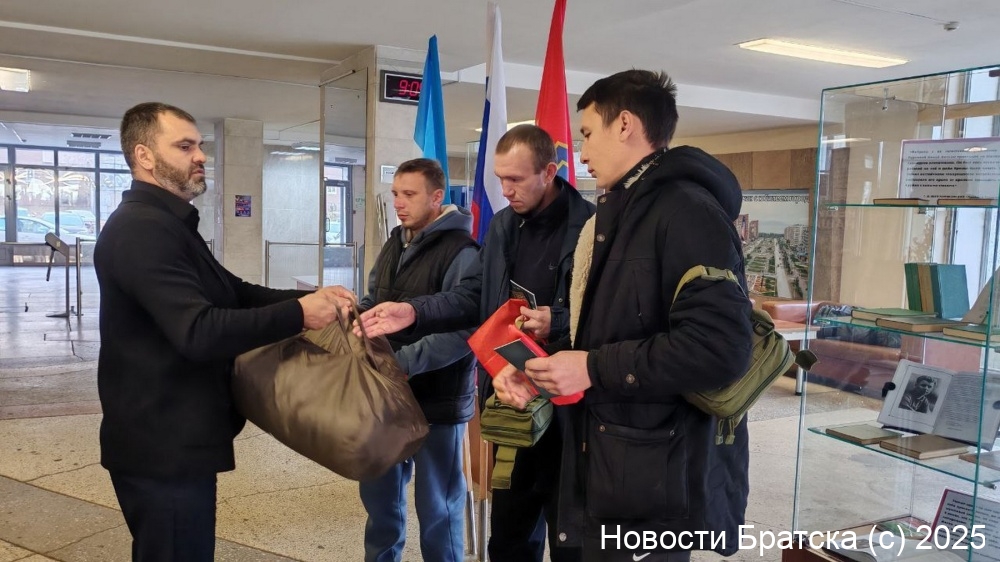 Братчане выразили желание встать на защиту Родины и отправиться в зону проведения специальной военной операции. По традиции им вручили флаги Братска и шевроны с изображением герба, а также мешки с продовольствием, аптечки и спальные мешки от братских предпринимателей.