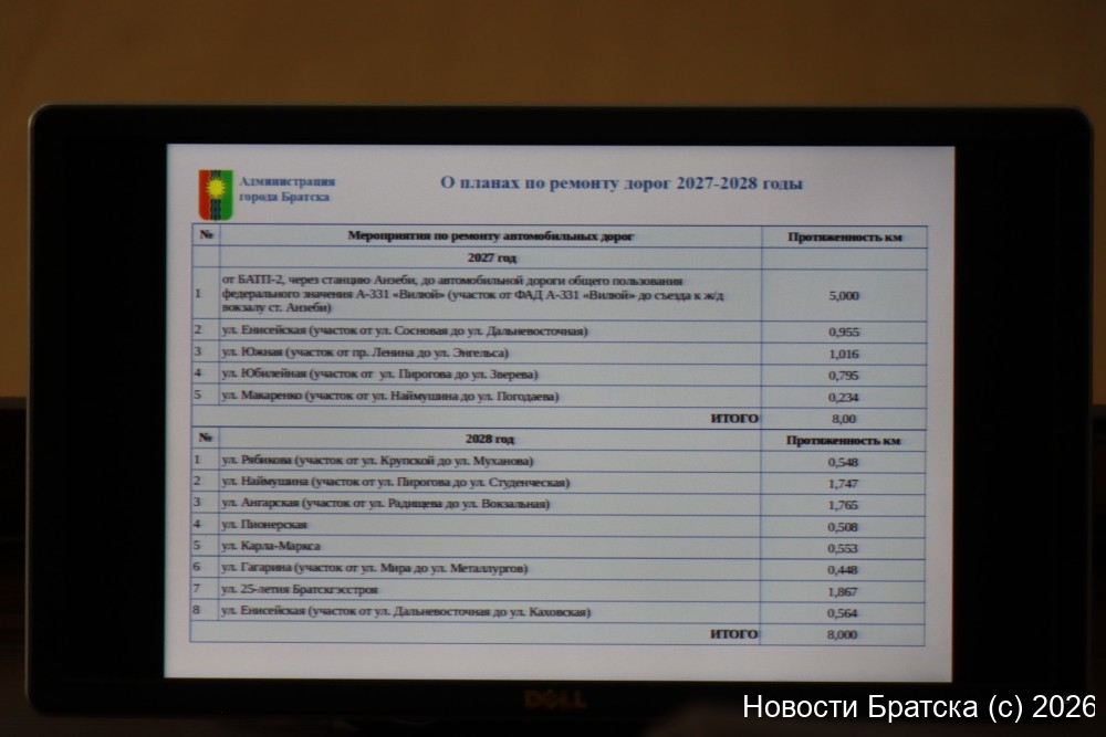 — В ноябре 2025 года для участия в отборе муниципальных образований Иркутской области на получение субсидий из областного бюджета на осуществление дорожной деятельности в отношении автомобильных дорог общего пользования местного значения, входящих в транспортный каркас Иркутской области, администрация города Братска подала соответствующую заявку. Отбор пройден, заявка министерством транспорта Иркутской области одобрена, — сообщила Татьяна Годкова. — Перечень дорог для проведения ремонта сформирован с учётом размера запланированных субсидий и целевых показателей. Начиная с 2027 года у министерства транспорта вводится показатель: нужно ремонтировать восемь километров дорог. Сумма финансирования с привлечением средств, которая у нас была обозначена, в 2027–2028 годах будет увеличена. В связи с этим эти два показателя — и километраж, и качество дорог — повлияли на формирование перечня.