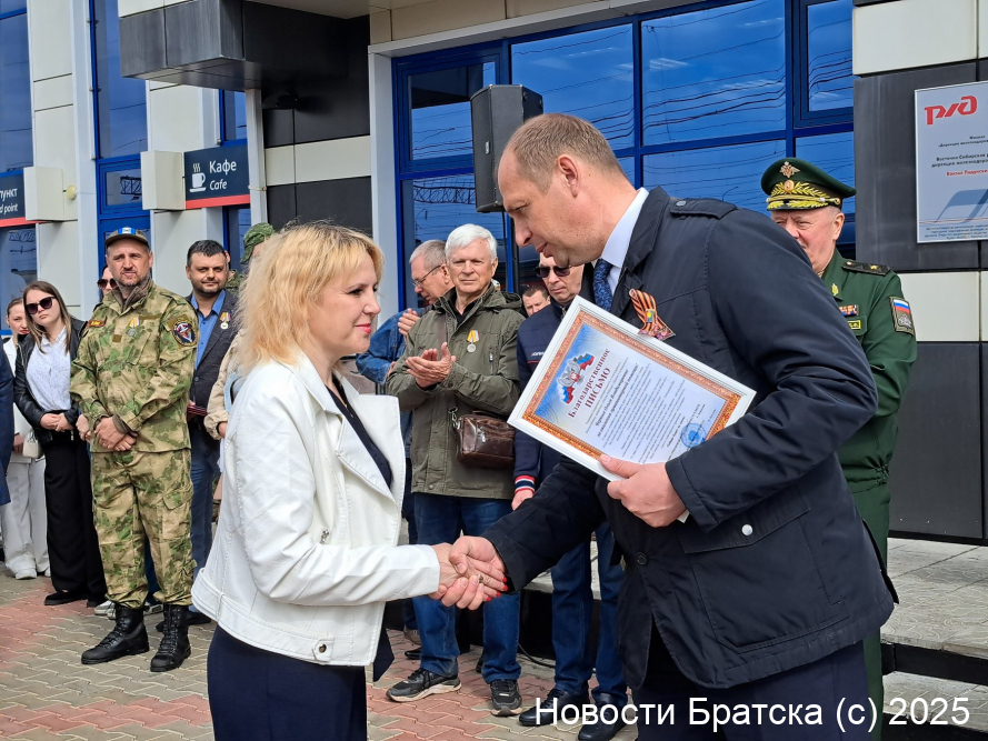 Председатель думы Братского района Светлана Коротченко передала мобилизованному Василию флаг родного района. Она отметила, что флаг Братска уже есть у бойцов, и теперь пусть флаги двух территорий там встретятся и земляки-братчане покажут свою ратную силу. Сергей Серебренников подтвердил, что флаг города был передан нашим защитникам, а также рассказал, что с именем «Братск» есть танк и БТР.
